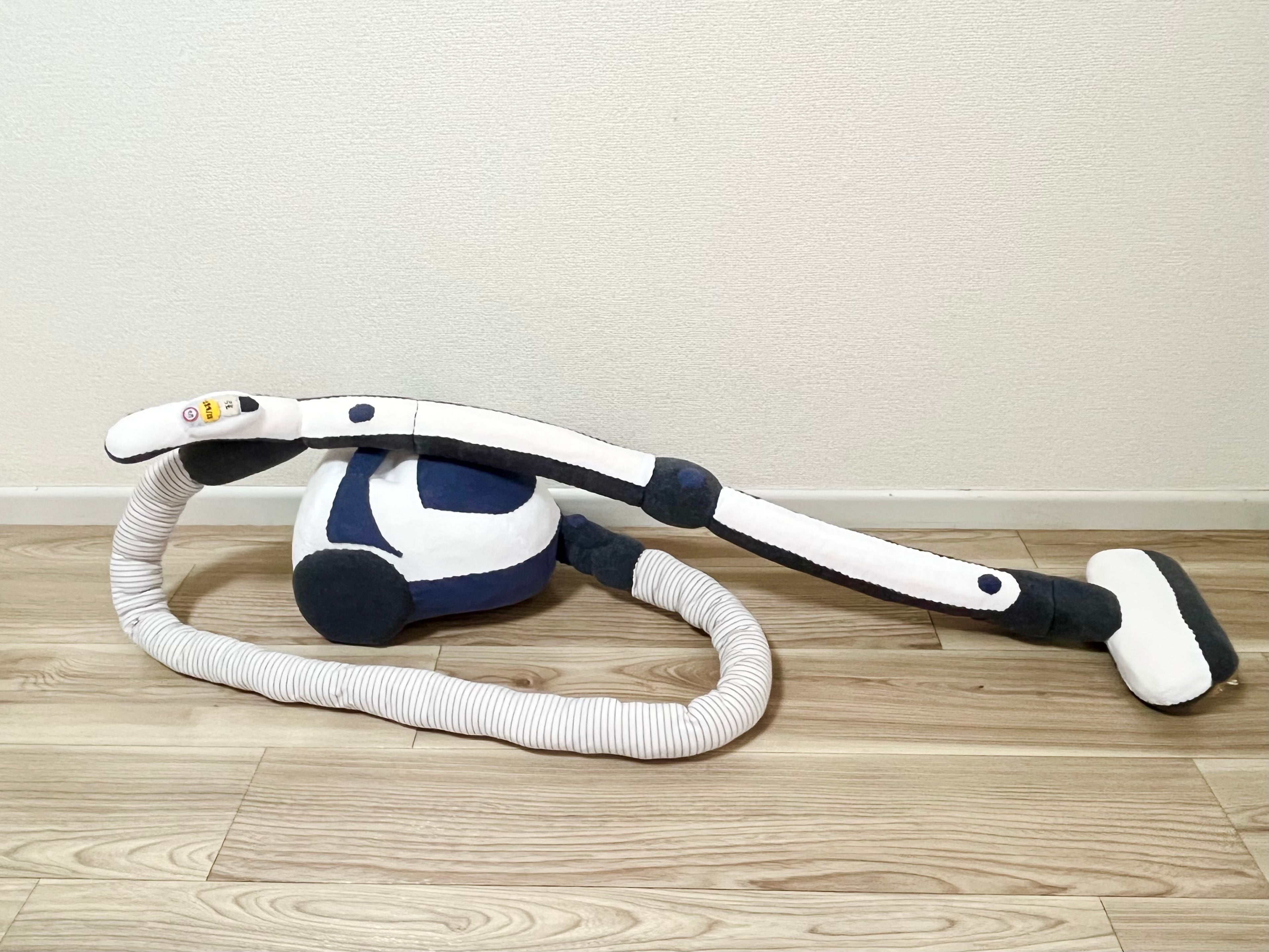 実物大掃除機のぬいぐるみ。まったり休んでいるときでも、隣に置いておくと掃除途中の雰囲気が出ます。