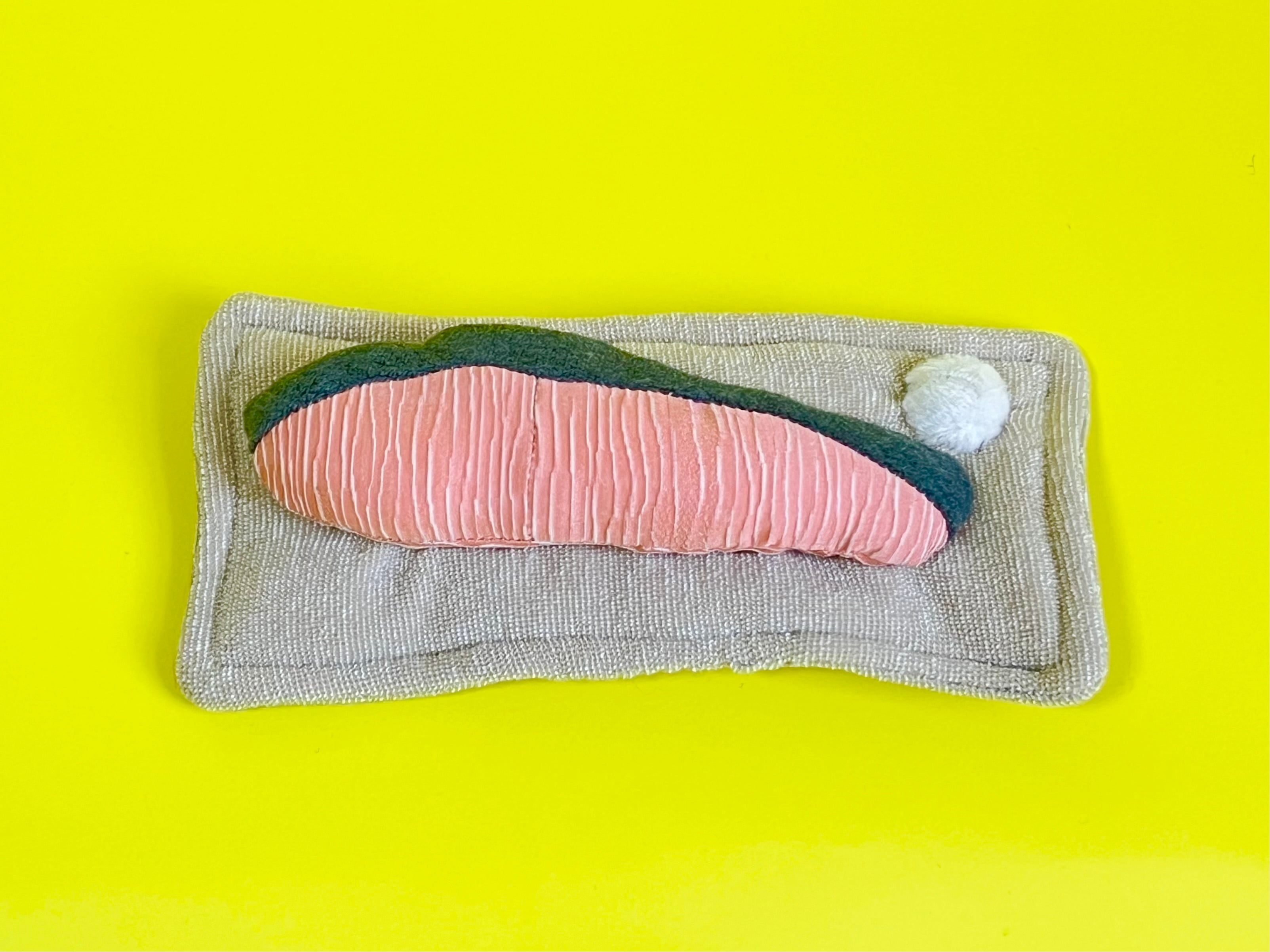 しゃけのぬいぐるみ。テーブルに置くとおかずが1品増えます。